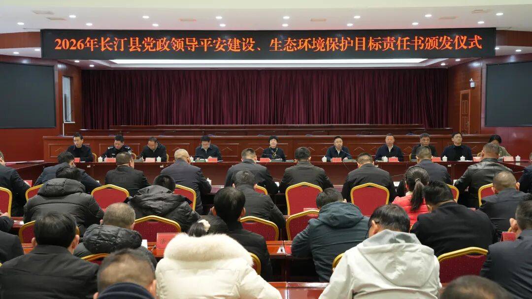 2月12日,2026年长汀县党政领导平安建设、生态环境保护目标责任书颁发仪式举行。县委书记吕莉,县委副书记、县长罗天进代表县委和县政府向各乡(镇)党政主要领导颁发2026年党政领导平安建设、生态环保目标责任书。县领导刘荣海、黄子华、肖剑剑、赖文生、江亮亮、吴江滨,县法院院长张寿安,县检察院检察长邱祥美及各有关单位负责参加。